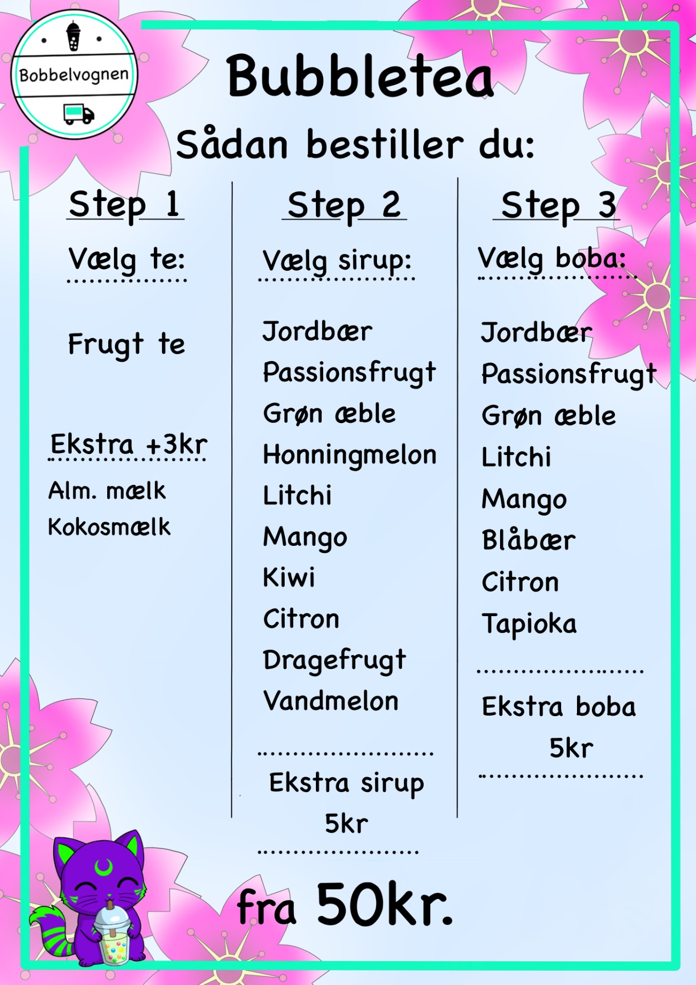 Vi kan tilbyde en lang række frugtige smagsvarianter som kan mixes og matches helt efter eget ønske. Hvis man ikke er til den frugtige udgave af bubbletea kan vi også lave en klassisk variant der er lavet på te, mælk, sukker og de klassiske tapioka-perler.